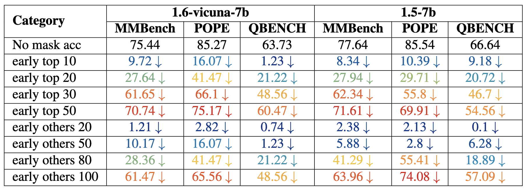 Performance drops for both models, measured in MMBench, POPE, and QBENCH. The results highlight the performance impact under different early stage masking conditions.