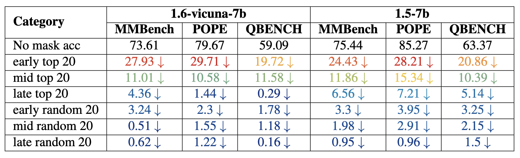 Performance drops for both models, measured in MMBench, POPE, and QBENCH. The results highlight the performance impact under all stages masking conditions.