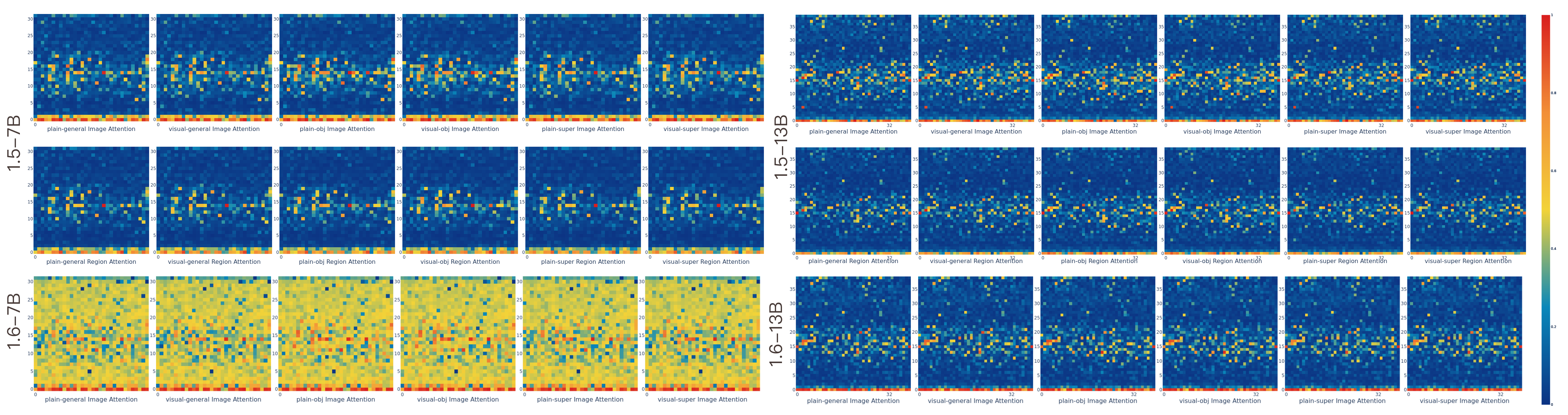 The image heatmap visualizes the total attention weight across image tokens and image region tokens. Attention is concentrated in specific layers, particularly in the early and middle layers. Comparing visual and plain generative tasks, we observe that the bounding box does not alter the attention head patterns. However, when comparing with a plain object prompt, including the object name in the question prompt activates additional attention heads not triggered by the visual prompt, suggesting that the attention heads exhibit dynamic activation based on the context—whether visual or linguistic. This highlights their ability to adjust their function and behavior in response to changing inputs. Further comparison between versions 1.6 and 1.5 demonstrates an improvement in image attention across all layers in version 1.6. However, this pattern is not as evident in the 1.6 13B model. The region token attention is omitted in 1.6 due to the more complex handling of the input image, making it challenging to track bbox token indices. Additionally, we see that the visual prompt does not improve the attention head’s focus on specific regions, as evidenced by comparing the first and second rows of the heatmap.
