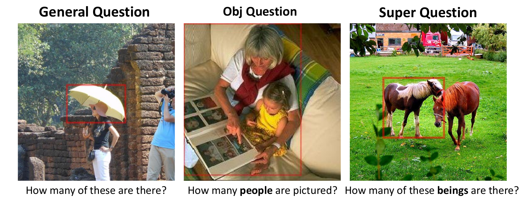 • Question types (general, object, and super-object queries).