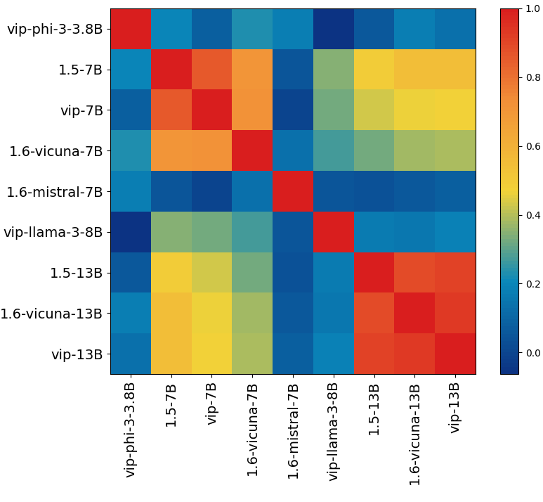The visual heads of models within the same family exhibit a strong correlation, meaning that models of the same type typically share the same set of visual heads. In contrast, the visual heads of models from different families are distinctly different.