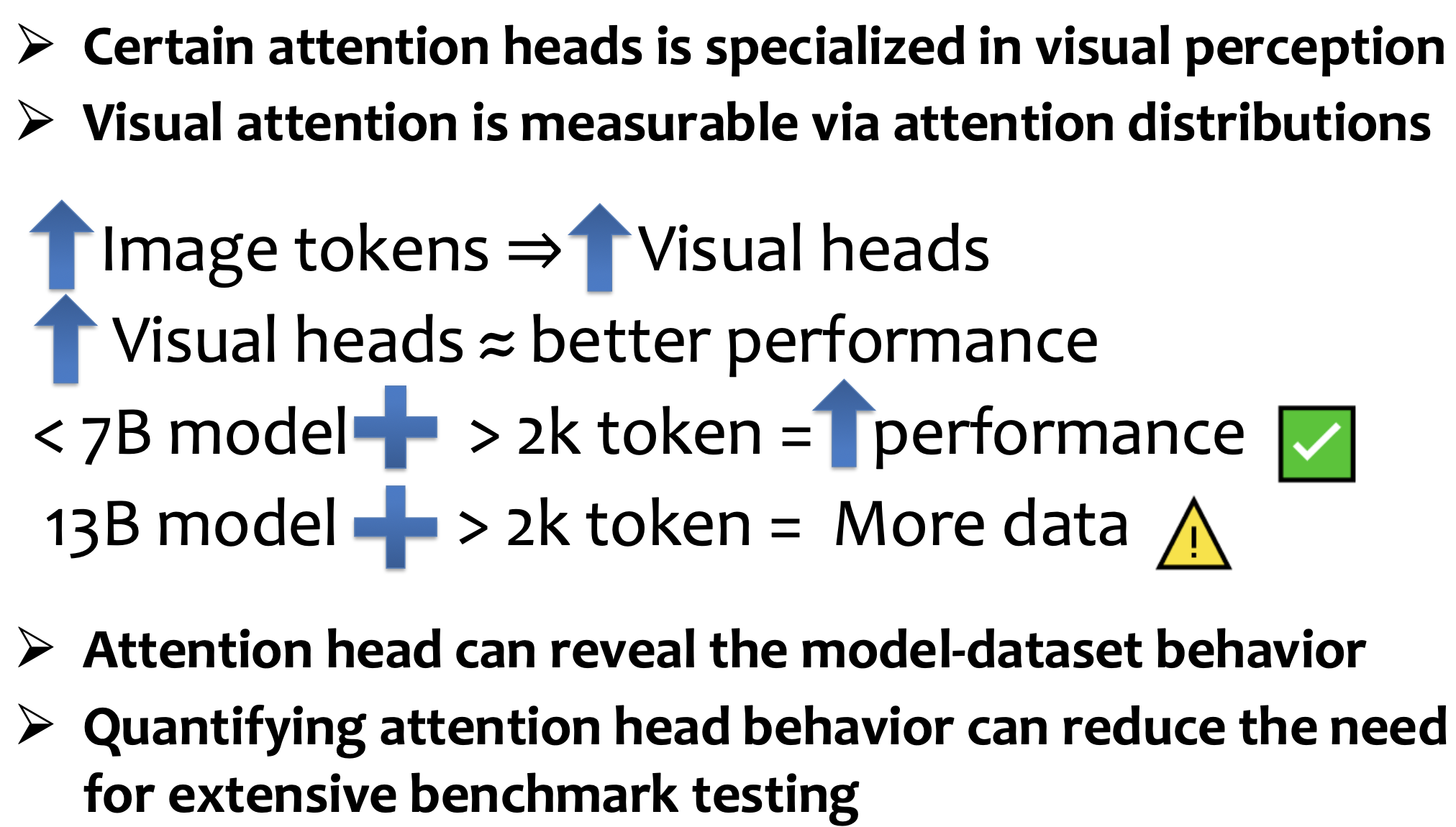 Visual head behavior serves as a quantifiable metric for measuring multimodal language model capabilities. Our analysis reveals that attention patterns in specific heads directly correlate with visual understanding performance.
